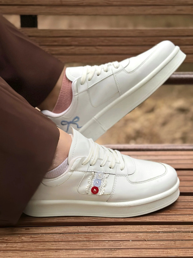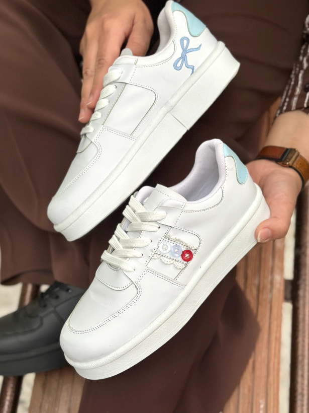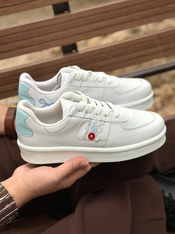 کفش ونس زنانه مدل دکمه و پاپیون رنگ سفید آبی - کد 303